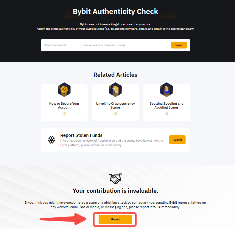 Если вы уже включили код защиты от фишинга, но он отсутствует или указан некорректно, полученное электронное письмо или SMS могут быть мошенническими. В таких случаях не нажимайте на ссылки и не выполняйте никакие действия из сообщения. Вместо этого сообщите об этом в Bybit, нажав на Сообщить на этой странице.