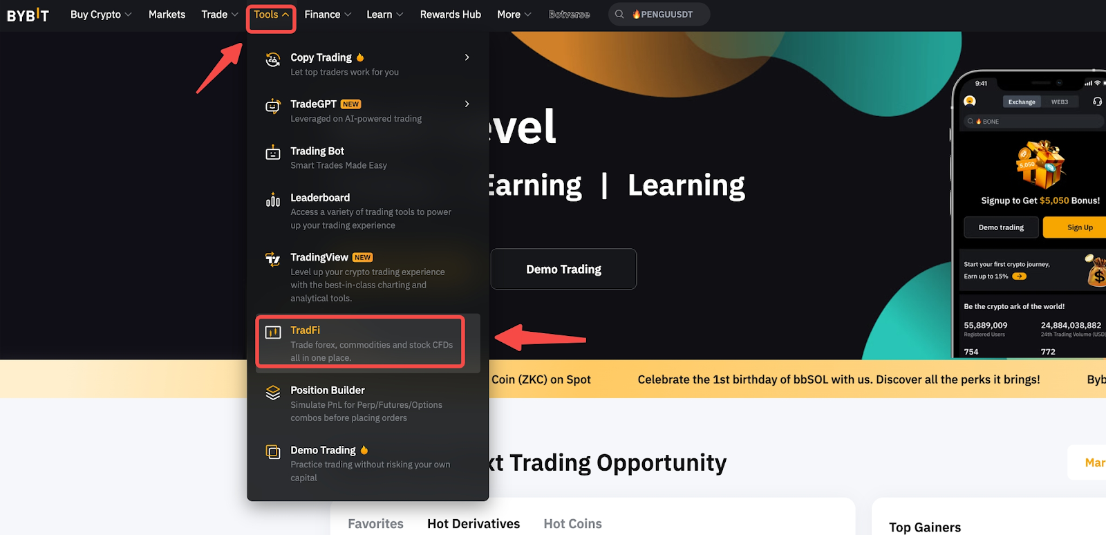 Шаг 1. Войдите в свою учетную запись Bybit и наведите курсор на Инструменты на панели навигации, затем нажмите TradFi.