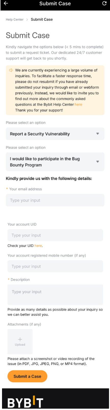 Bybit предоставляет пользователям простой и удобный способ отправки запросов и получения поддержки. Следуйте приведённым ниже инструкциям, чтобы обеспечить быструю обработку и своевременное решение вашего вопроса.