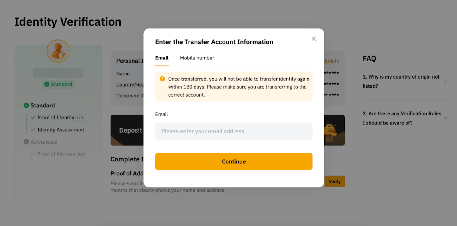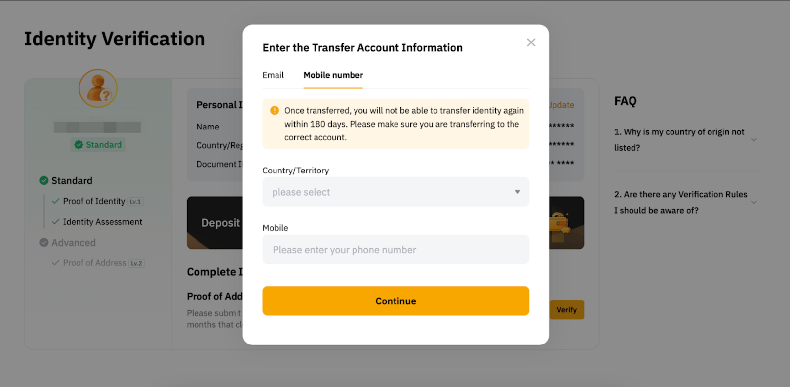 4. После завершения переноса идентификационных данных, если у вас остались активы в вашей старой учетной записи (которая более не верифицирована), вы все равно можете выполнять вывод средств или внутренние переводы после 24-часового периода ограничения на вывод средств. Однако, если вы собираетесь выполнить внутренний перевод, учетная запись получателя должна быть верифицированной учетной записью.