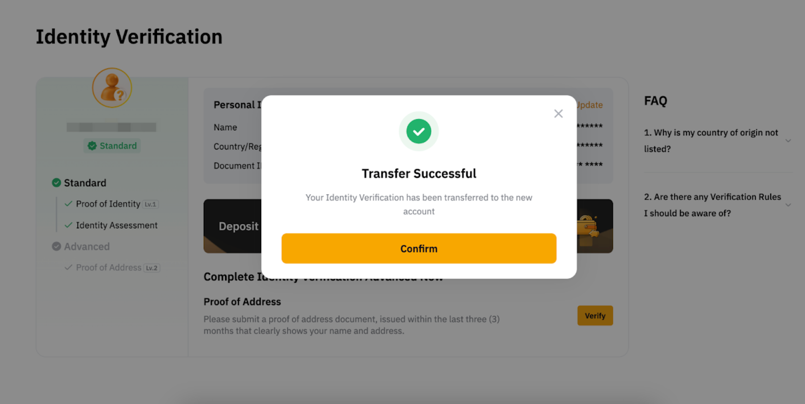 Шаг 7. После прохождения верификации вы успешно перенесете информацию о личности на целевой аккаунт. Текущий аккаунт будет иметь неподтверждённый статус.