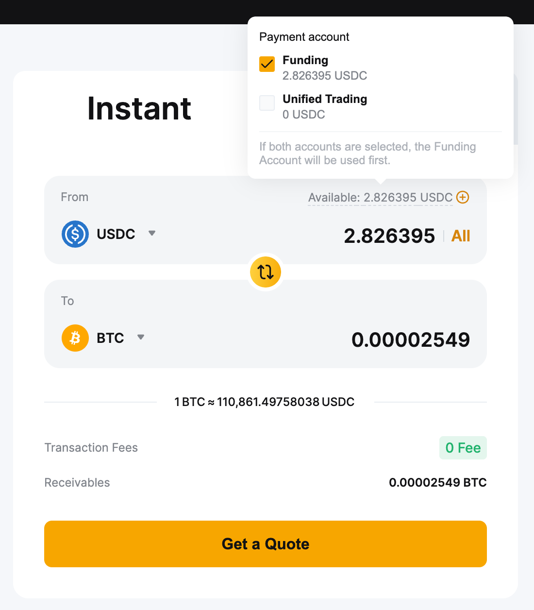 1. Мгновенный режим поддерживается как на Аккаунте Финансирования, так и на Едином торговом аккаунте, в то время как Лимитный режим доступен только через аккаунт Финансирования. Прежде чем продолжить конвертацию, пожалуйста, убедитесь, что средства находятся на правильном аккаунте.