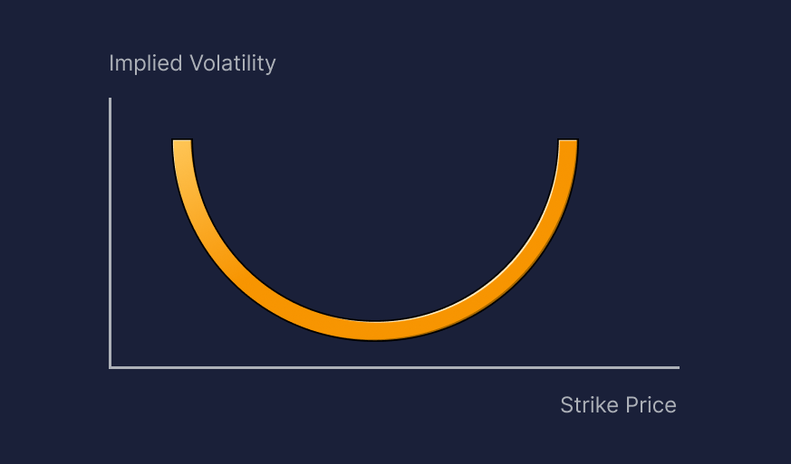 На графике мы соединили значения подразумеваемой волатильности для разных цен исполнения. Симметричная кривая с левой и правой стороны называется улыбкой волатильности, а асимметричная — ухмылкой. Кривая демонстрирует перекос значений подразумеваемой волатильности.