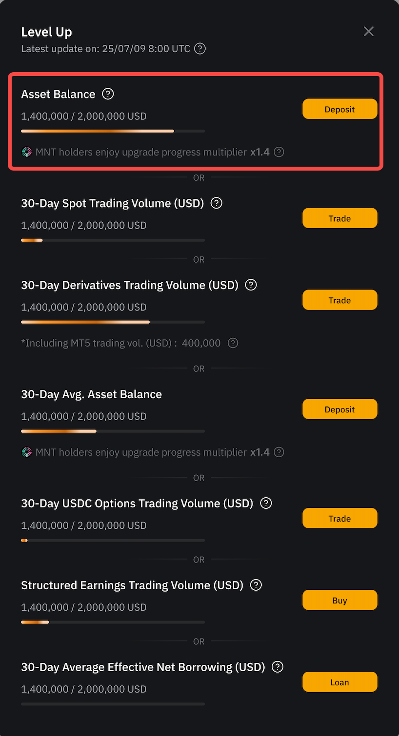 Примечание: Множитель не применяется к VIP 5, поскольку переход с VIP 5 на Supreme VIP основан на объеме торговли за 30 дней, а не на балансе активов. Более подробную информацию см. в разделе Часто задаваемые вопросы — Множитель MNT.