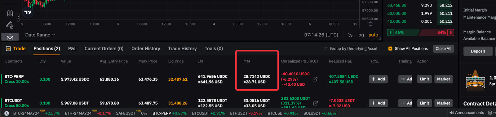 Поддерживающую маржу (ПM), необходимую для позиции, можно найти на вкладке позиции.