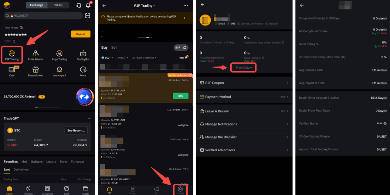 Если вы находитесь в приложении, перейдите на страницу P2P и нажмите на иконку профиля, чтобы открыть центр пользователя P2P. Нажмите Ещё, чтобы отобразить информацию о P2P-трейдинге.