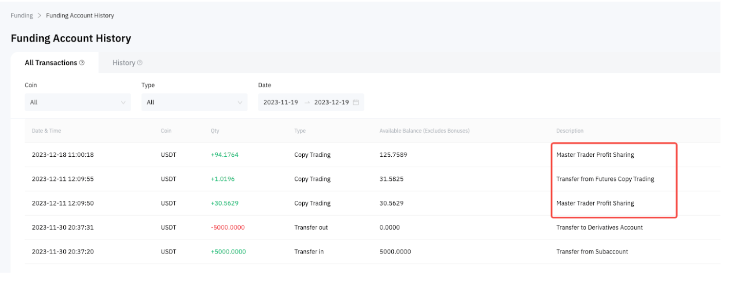 Ви можете переглянути запис про розподіл прибутку в історії акаунта фінансування.