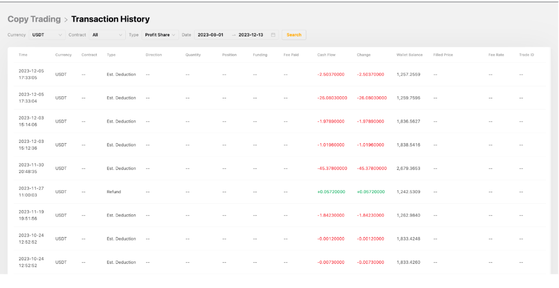 1. Система щодня розраховує чистий P&L, отриманий підписниками, враховуючи суму прибутку і збитку протягом циклу розрахунків. Система попередньо вираховує коефіцієнт розподілу прибутку із щоденного прибутку, отриманого заздалегідь. Якщо в день розрахунку фактична сума частки прибутку є нижчою за попередньо вирахуваний прибуток від копіугод, надлишкова сума буде повернута на акаунт фінансування підписника, а сума частки прибутку буде зарахована на акаунт фінансування майстер-трейдера.