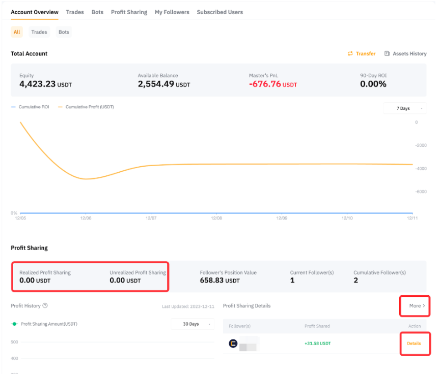 Якщо ви хочете переглянути розподіл прибутку під кожним майстер-трейдером, натисніть на Деталі відповідного майстер-трейдера, і ви можете побачити це в Огляді акаунта.