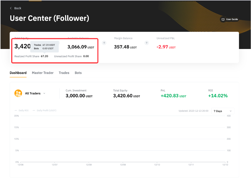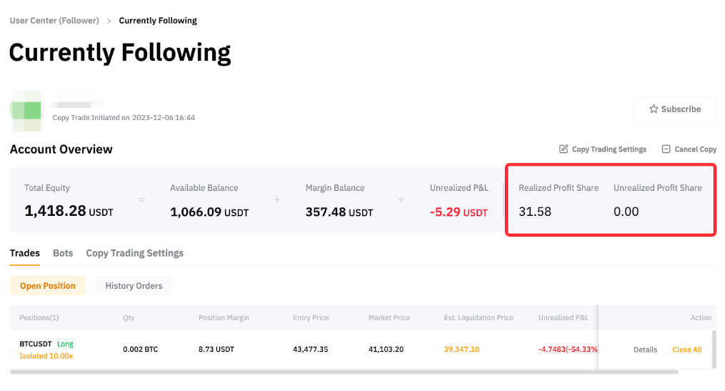 Перейдіть до Центру користувача (підписники), і ви зможете побачити свою Частку реалізованого та нереалізованого прибутку для угод за безстроковими контрактами в USDT і торгових ботів.