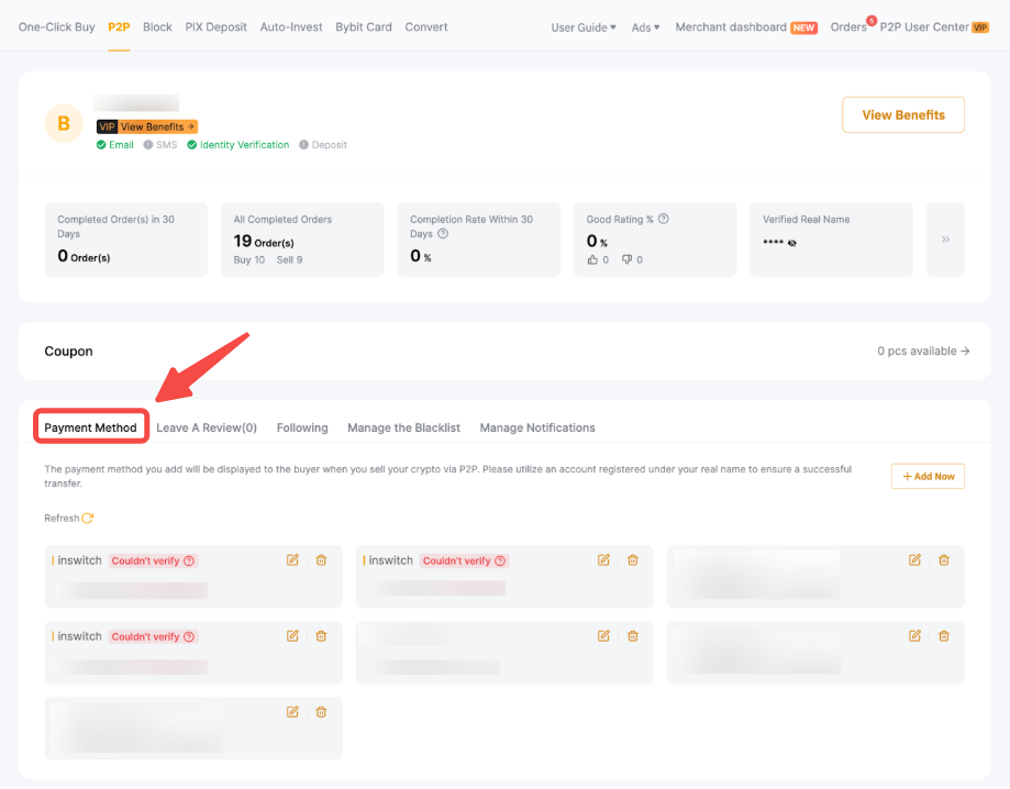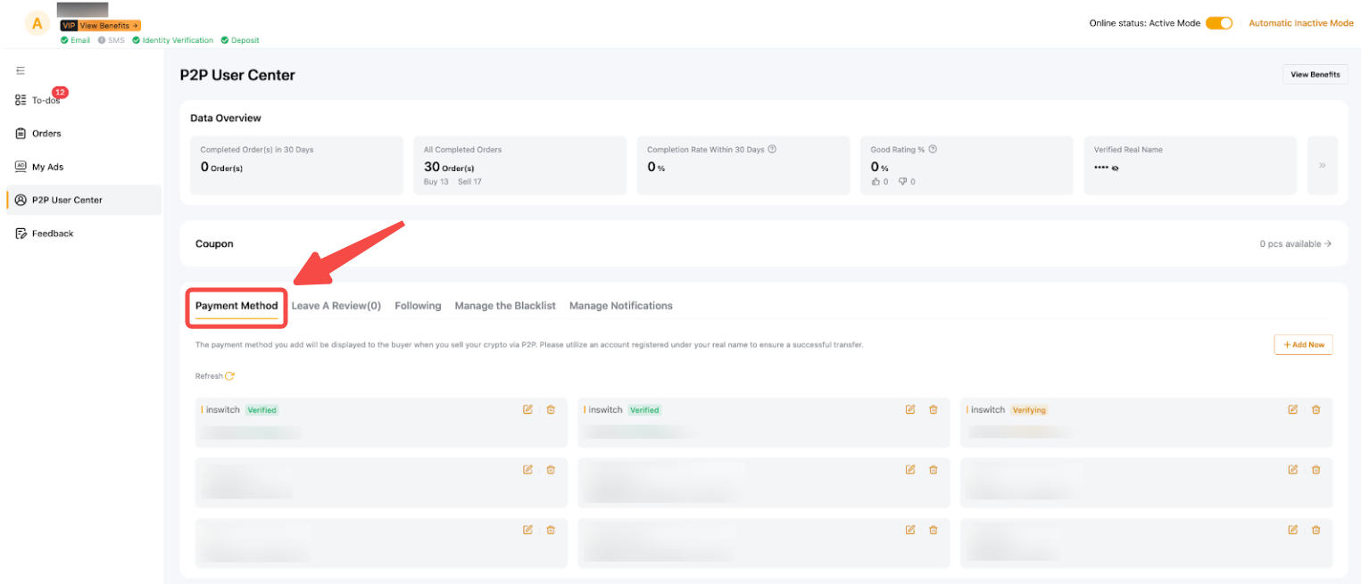 Ви можете перевірити статус підтвердження на сторінці способів оплати. Щоб отримати доступ до цієї сторінки, перейдіть до Центру користувача P2PСпосіб оплати.