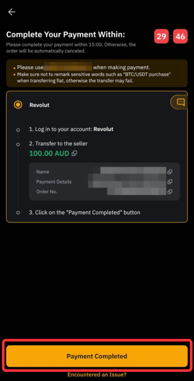 Здійснюйте оплату у фіаті відповідно до вибраного вами способу оплати. Будь ласка, переконайтеся, що ви переказуєте потрібну суму на потрібний акаунт правильними способами. Після цього натисніть кнопку Платіж виконано, щоб повідомити про це продавця.