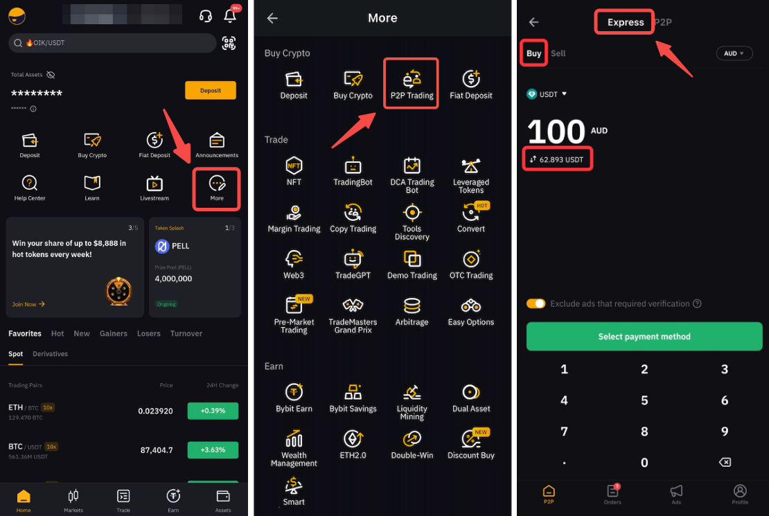 P2P Express розроблений як швидка й ефективна однорангова угода, що дає змогу трейдерам P2P купувати криптовалюту в інших трейдерів без посередників у застосунку Bybit. Це спрощує для початківців швидке отримання котирувань без клопоту сортування численних оголошень.