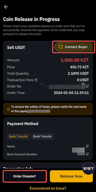 — Будь ласка, зверніть увагу, що на нашій платформі суворо заборонено здійснювати оплату через третіх осіб. Платіжний акаунт, який використовується для здійснення платежу, має бути таким самим, як і підтвердження особи на Bybit. Інакше продавець має право відмовитися від продовження торгівлі з вами та повернути вам кошти.