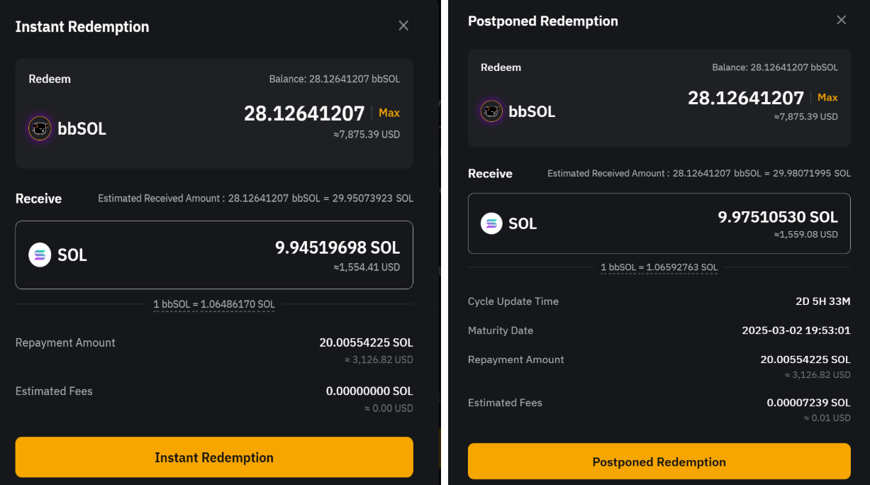 Відкладений викуп: Отримайте повну основну суму та всі прибутки після 1–4-денного періоду обробки, протягом якого відсотки продовжуватимуть нараховуватися. Ваші bbSOL буде конвертовано в SOL за актуальним курсом обмін, коли ви подасте запит на викуп.