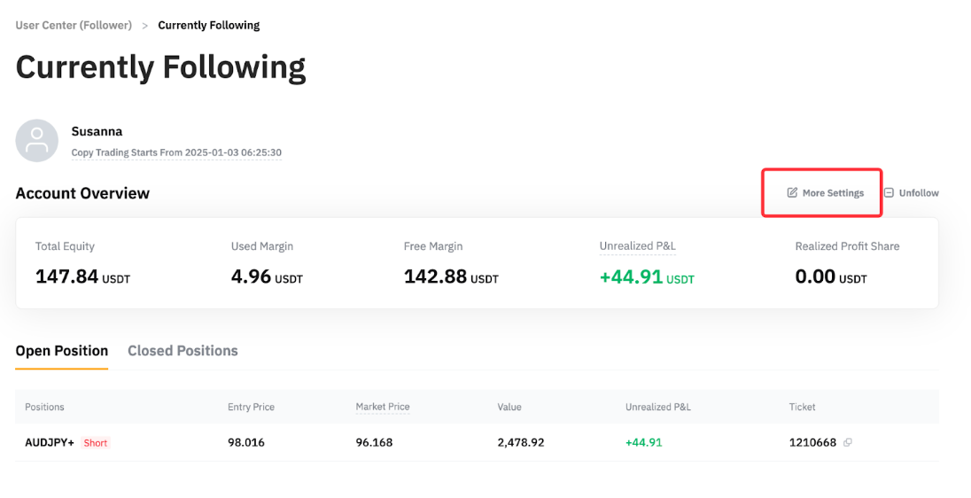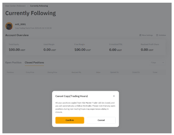 Усі позиції відповідного майстер-трейдера будуть закриті, й ви автоматично припините підписку на майстер-трейдера, коли спрацює TP/SL. Зверніть увагу, що тригери стоп-лосу (SL) не виконуються миттєво, і через ринкові умови, пріоритет виконання та час обробки системи може виникнути затримка на кілька хвилин.