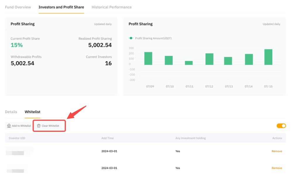 Щоб видалити Інвестора з білого списку, перейдіть до Центру майстра Pro → Інвестори та розподіл прибутку → Білий список, знайдіть Інвестора, якого ви хочете видалити, та натисніть Видалити.