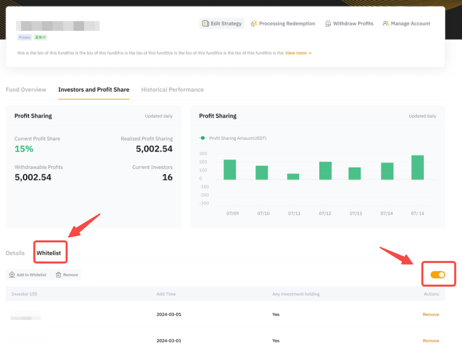 Існуючі інвестори, які не внесені до білого списку, можуть лише викупити активи; вони не зможуть інвестувати більше у вашу поточну стратегію чи будь-які нові стратегії.