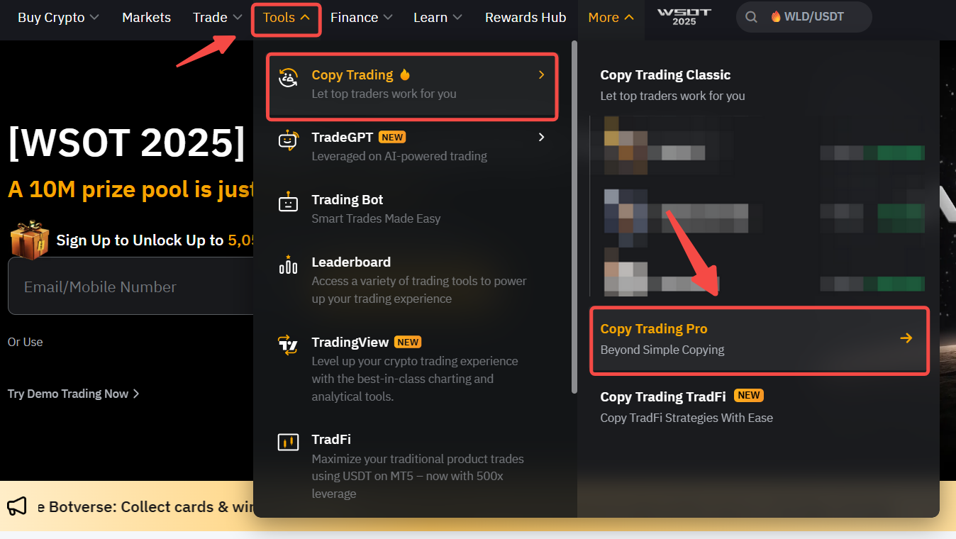 Крок 1. Увійдіть на вебсайт Bybit, а потім натисніть Інструменти → Копітрейдинг → Копітрейдинг Pro на панелі навігації.