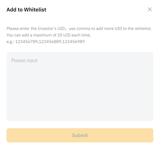 — Ви можете імпортувати до 20 номерів UID за раз. Обмежень щодо загальної кількості інвесторів у білому списку немає.