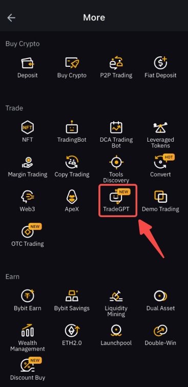 Користувачі застосунку Bybit можуть отримати доступ до TradeGPT, натиснувши Більше на головній сторінці Bybit і вибравши TradeGPT.