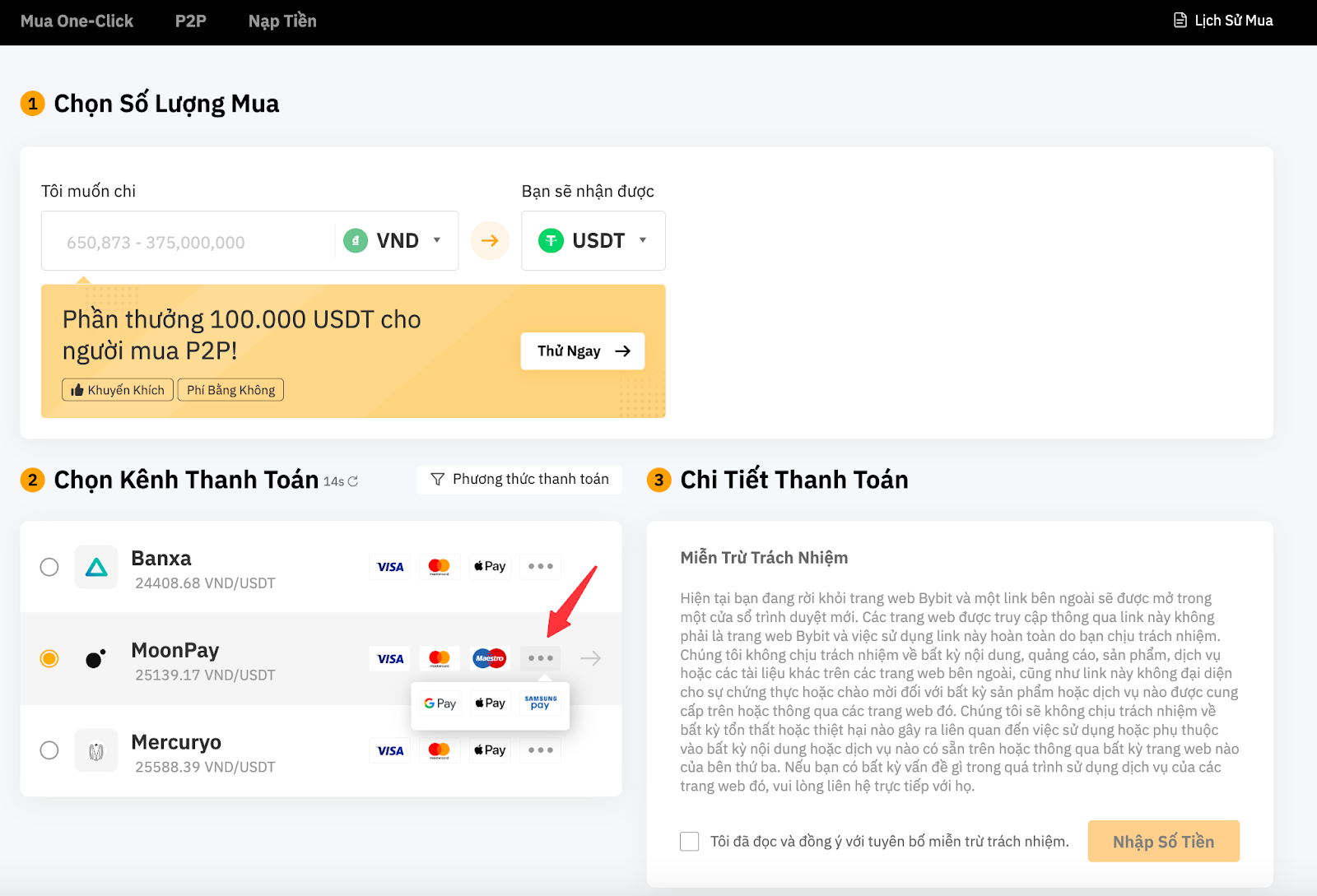 Bạn có thể tìm thấy danh sách các quyền chọn Fiat và tiền điện tử được hỗ trợ trên trang Mua One-Click và tìm thấy sự sẵn có của các phương thức thanh toán của bên thứ ba. Ngoài ra, bạn có thể truy cập trang lệnh của Bên Thứ Ba bằng cách nhấp vào danh sách thả xuống Fiat hoặc coin.
