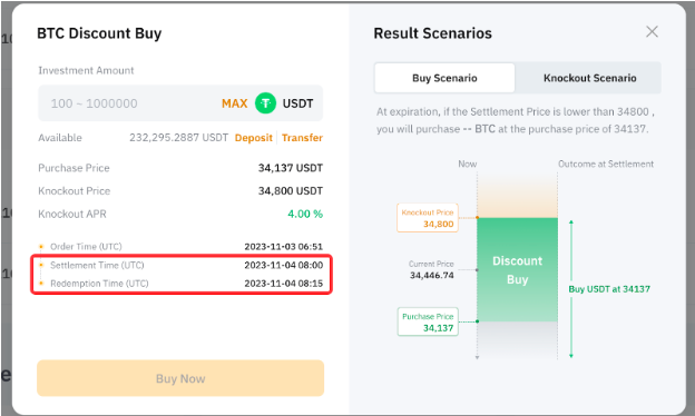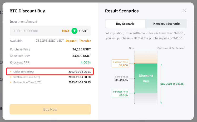 Nếu Nhà giao dịch A muốn đầu tư 10.000 USDT vào BTC bằng cách sử dụng quyền chọn Mua Chiết Khấu và giá thị trường hiện tại của BTC là 30.500 USDT,