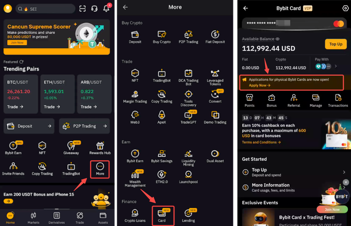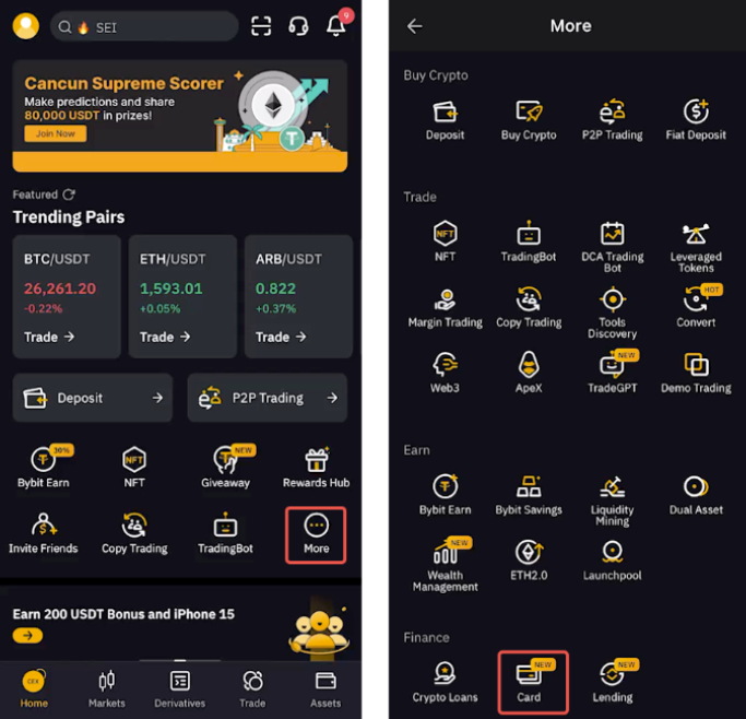 第 1 步: 启动 Bybit App,登录您的账户。点击主页上的更多,然后点击。点击 Bybit Card 申请实体卡横幅上的立即申请