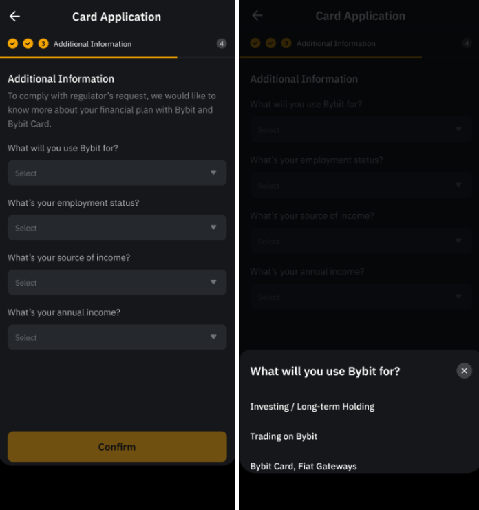 第 4 步:申报您的 Bybit Card 预期用途,并提供更多信息,包括您的就业状况、收入来源和年收入。