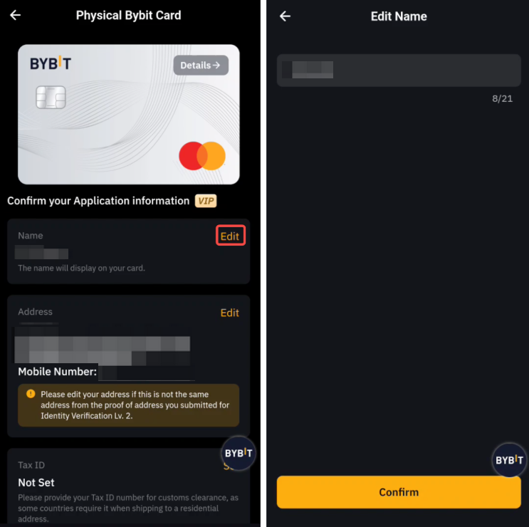 第 3 步: 编辑您的收货地址。请注意,送货地址应与提交虚拟 Bybit Card 地址验证的地址相同。