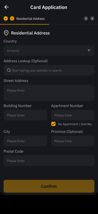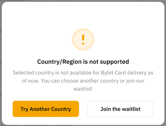 注:Bybit Card 目前仅在有限国家/地区提供。如果您所选的居住国家/地区不在支持的国家/地区,我们将立即记录您的此次申请,并在 Bybit Card 即将支持您的国家/地区时通知您。