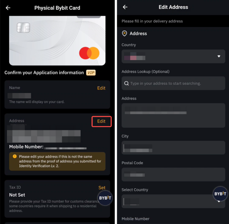 — 如果修改后的地址与您的虚拟 Bybit Card 地址认证不一致,Bybit 有权拒绝任何地址更改申请。我们目前不支持提交地址证明来更改送货地址。