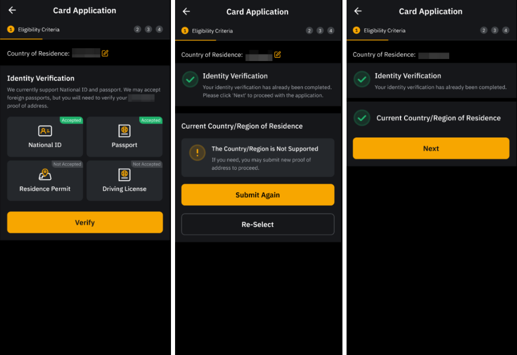 1. 如果您的身份证明文件不符合Bybit Card (AIFC) 的要求,请使用其他支持的证明文件再次验证,或者如果您不想继续,请点击取消申请