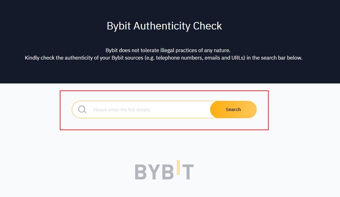 为确保任何与 Bybit 相关的域或信息来源(例如电子邮件、电话号码、URL 或社交媒体帐户)的合法性,请使用Bybit官方验证通道查询功能。