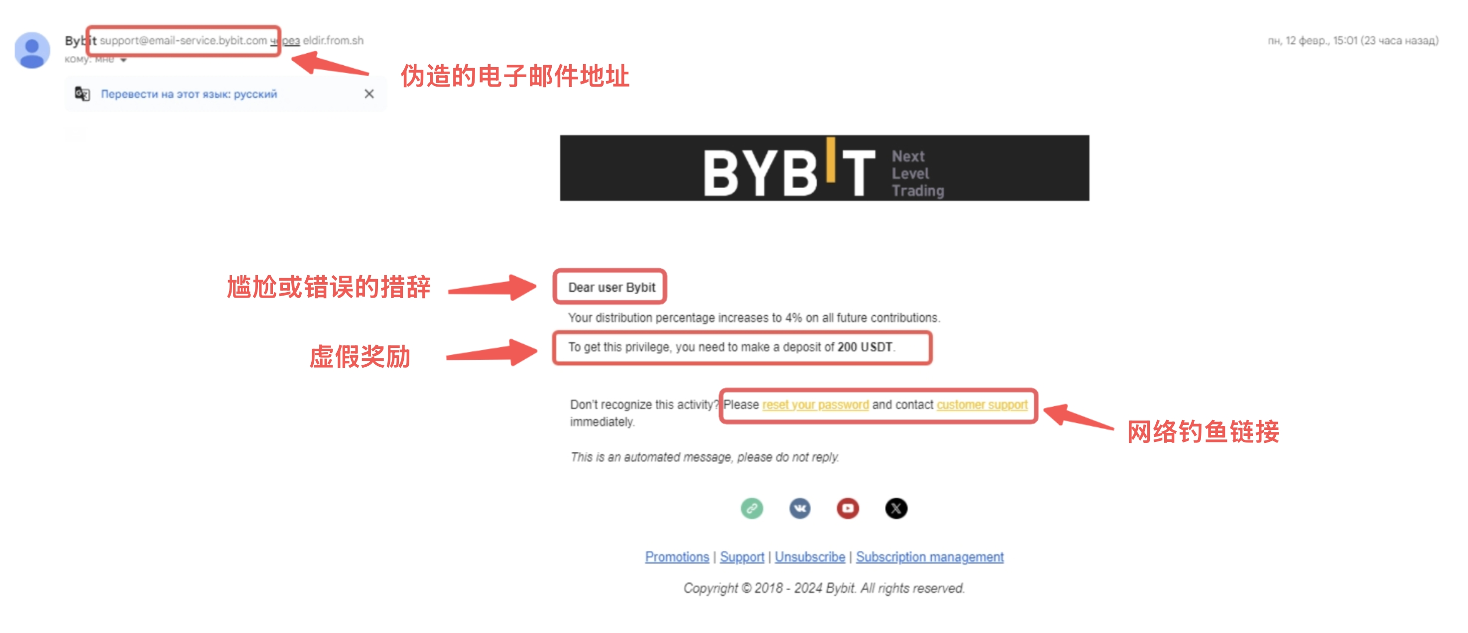 通过对照发件人的联系信息(例如电子邮件地址、电话号码、网站 URL 等)和已知的合法 Bybit 官方联系信息,查找任何不一致或可疑元素。