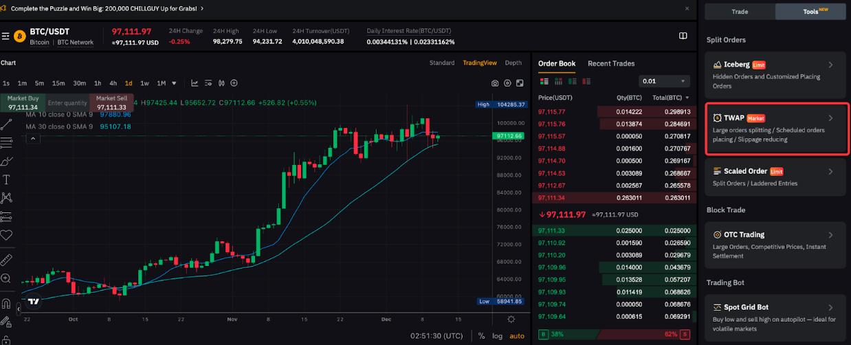 对于现货交易,通过 TWAP 策略下单的每个子订单的最大订单数量可点击此处查看。 对于永续和交割交易,每个子订单的最大订单数量必须 ≤ 此处所述最大订单数量的一半。例如,如果 BTCUSDT 的最大订单规模为 100 BTC,则每笔订单的最大数量为 50 BTC。