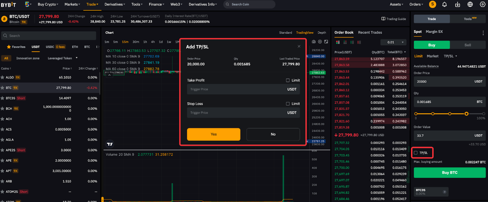 您可以设置止盈/止损订单的触发价格、订单价格(限价单)和订单数量。下达止盈/止损订单时,将会占用资产。一旦最新成交价达到预设的触发价格,就会根据当前的订单参数下达限价单或市价单。