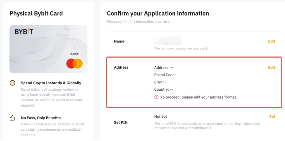 — 如果修改後的位址與您的虛擬 Bybit Card 位址認證不一致,Bybit 有權拒絕任何位址更改申請。我們目前不支持提交地址證明來更改送貨地址。