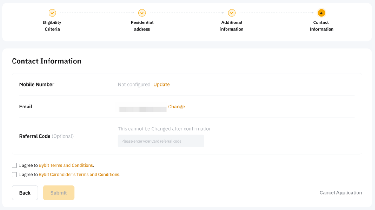 步驟 5:確認(或設定)您註冊的電子郵件地址和電話號碼。 閱讀並同意 Bybit 條款與條件以及 Bybit 持卡人條款與條件,然後點選提交