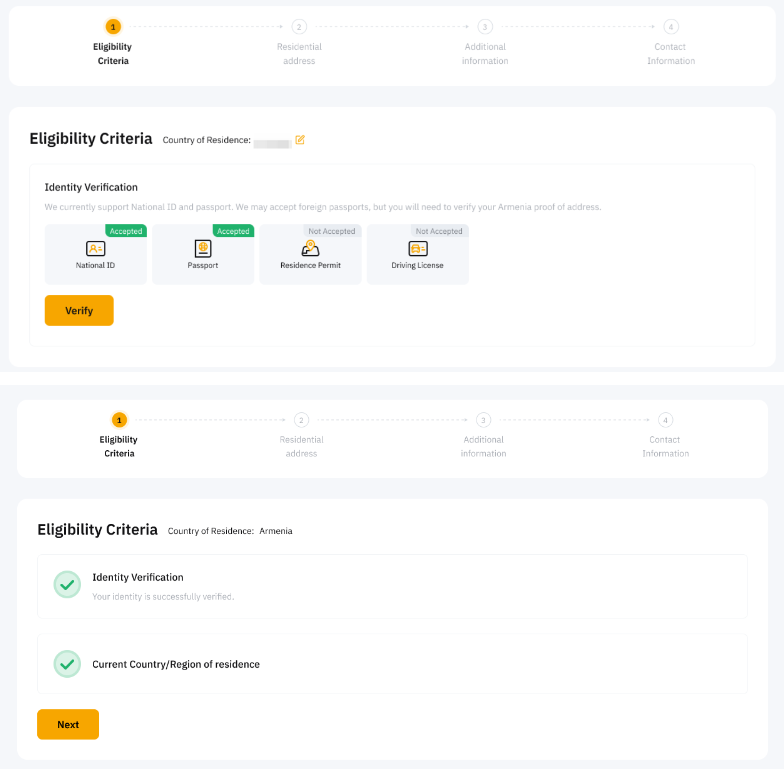 1. 如果您的身分證明文件不符合Bybit Card (AIFC) 的要求,請使用其他支援的證明文件再次驗證,或者如果您不想繼續,請點擊取消申請