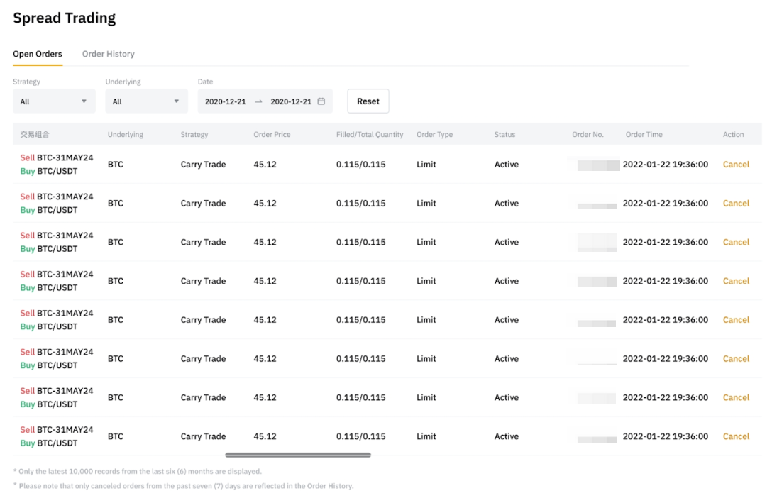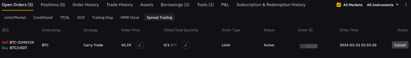 您可在任一交易頁面(例如價差交易、現貨與合約頁面)查看價差交易訂單,這些頁面展示的訂單數據完全相同。