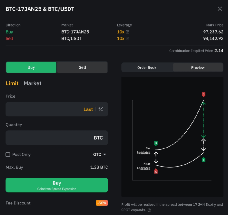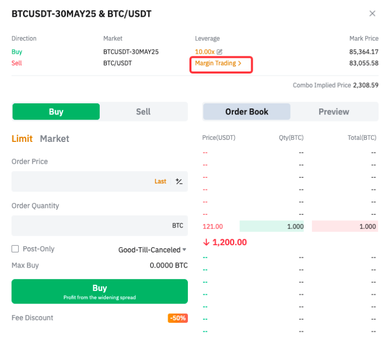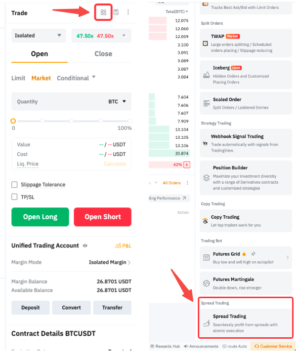您也可在現貨/合約交易頁面右側面板的工具選項卡中找到價差交易。