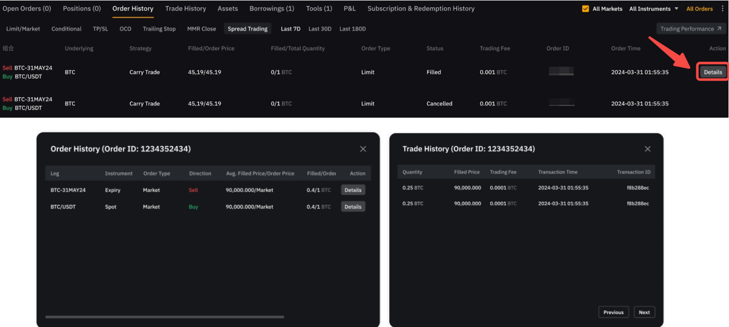 如需查看已成交訂單,可前往訂單歷史並點擊價差交易。點擊操作下方的詳情,即可查看每條腿的訂單信息。再次點擊詳情,可獲取更多信息。