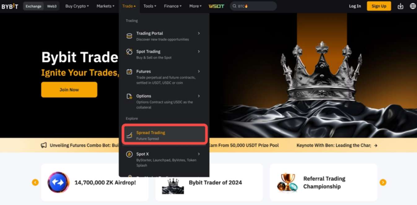 第 1 步:登錄 Bybit 官網,在導航欄中點擊交易 → 價差交易,進入價差交易頁面。